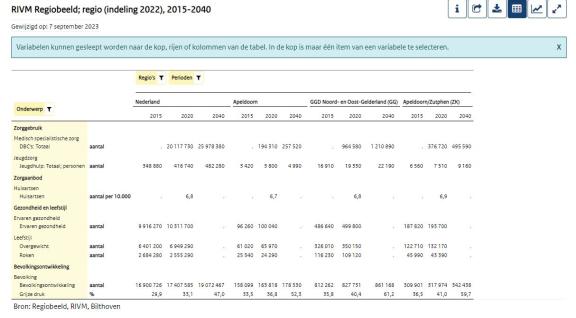 Alle Regiobeelddata zijn beschikbaar in de open-data omgeving van het RIVM: Statline - Regiobeeld. Deze zijn te vinden via de tab ‘Open data’.